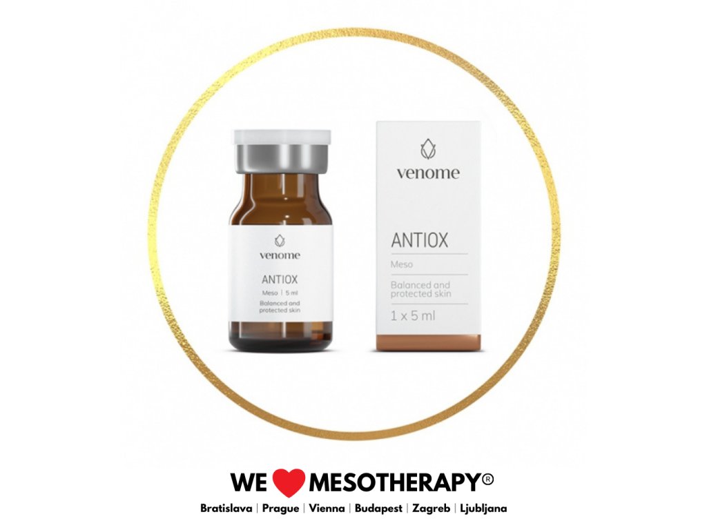 Venome Meso ANTIOX 5 ml - Antioxidačný štít nápomocný v boji proti pigmentácií a prejavom starnutia. Obsahuje jedinečnú kombináciu aktívnych zložiek podporujúcich procesy obnovy pokožky a obnovu ochrannej bariéry užitočnej v boji proti voľným radikálom.