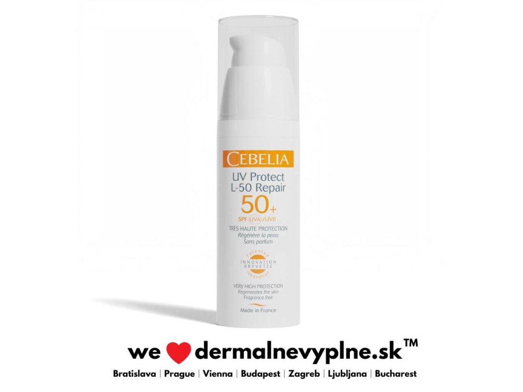 Cebelia UV PROTECT L- 50 REPAIR SPF 50 - Ľahký opaľovací hydratačný krém s regeneračnými vlastnosťami a zmatňujúcim efektom - je multifunkčný produkt starostlivosti o pleť 2 v 1, ktorý kombinuje veľmi vysokú ochranu pred slnkom s reparačným účinkom. Bol vytvorený s naším patentovaným peptidom Cebeline®, ktorý urýchľuje a zlepšuje regeneráciu pokožky, a trojicou širokospektrálnych filtrov šetrných k pokožke pre účinnú ochranu pred UVA a UVB lúčmi.
