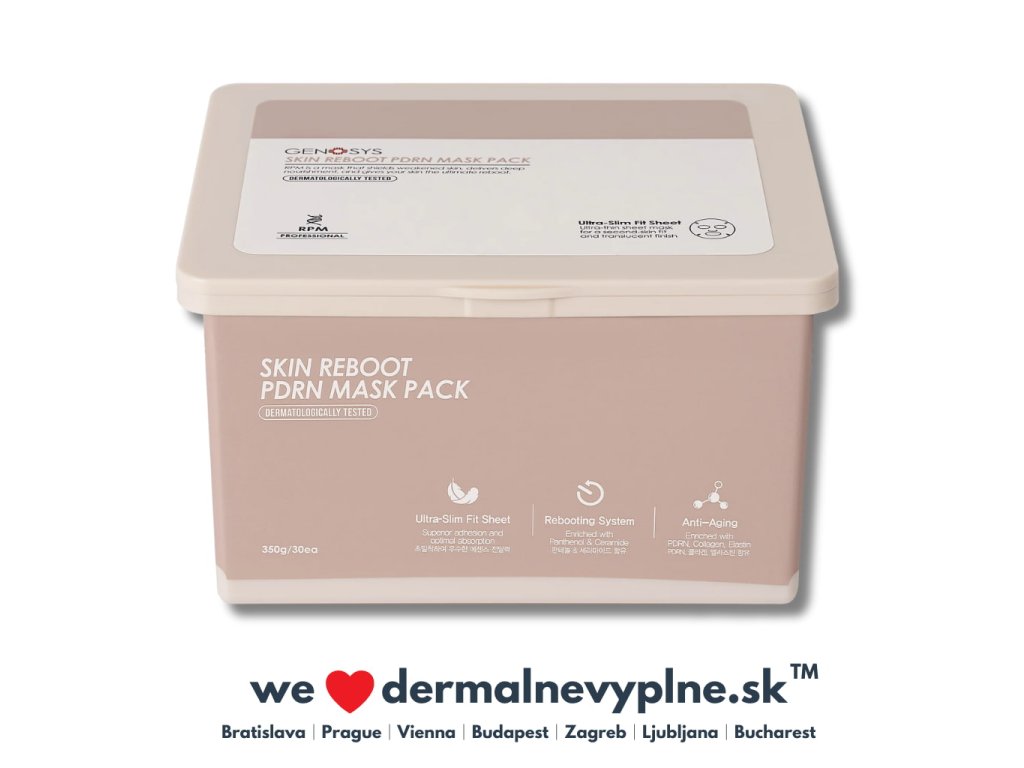 GENOSYS SKIN REBOOT PDRN MASK PACK je luxusná ultratenká plátenná maska určená na intenzívnu regeneráciu a hydratáciu pokožky. Vďaka unikátnemu obsahu PDRN (sodná soľ DNA z lososa), pantenolu, ceramidov a rastlinných extraktov poskytuje pokožke okamžitý reštart, podporuje obnovu kožnej bariéry, znižuje podráždenie a dodáva pleti mladistvý vzhľad. Ideálny produkt pre ošetrenie suchej, citlivej a starnúcej pleti.