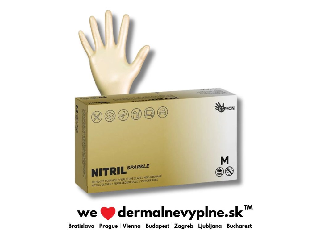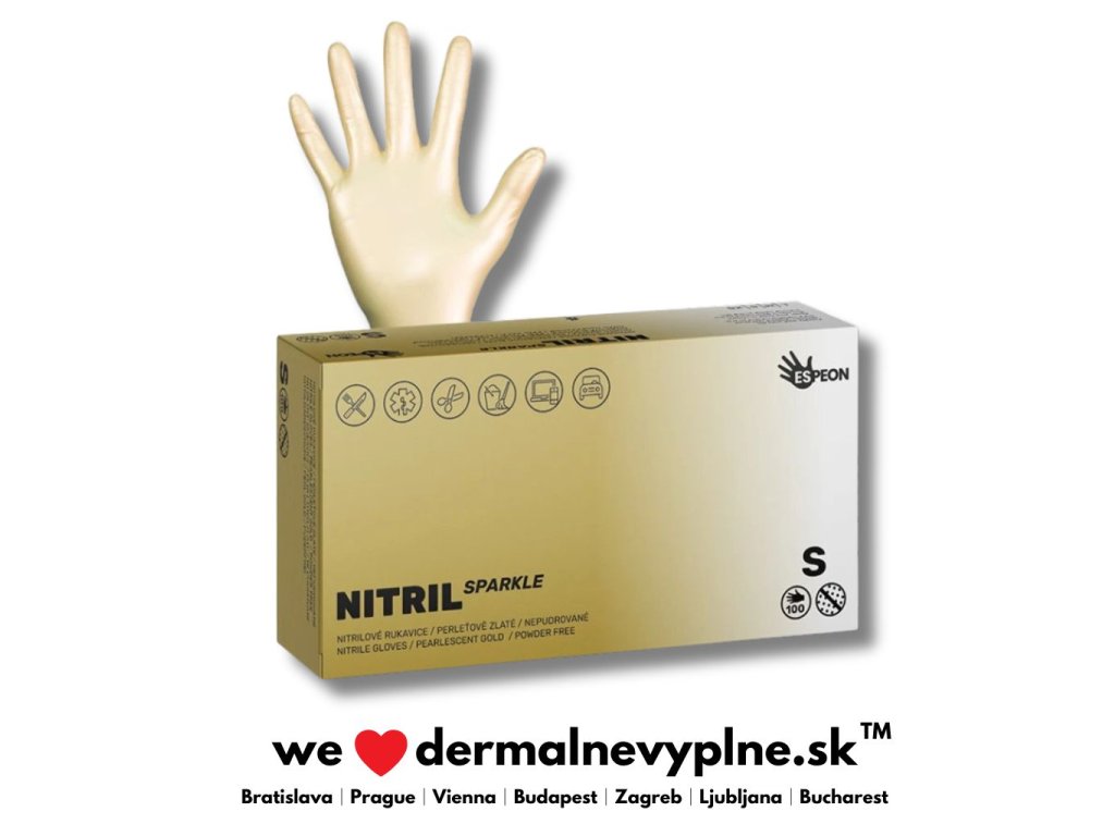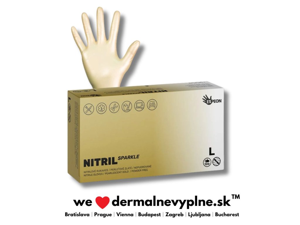 Nitrilové rukavice NITRIL SPARKLE perleťovo zlaté - sú vyrobené zo 100% syntetického nitrilu. Rukavice neobsahujú púder ani latex a nespôsobujú alergické reakcie. Veľmi dobre sa nosia a po krátkom čase sa prispôsobia Vašej ruke.