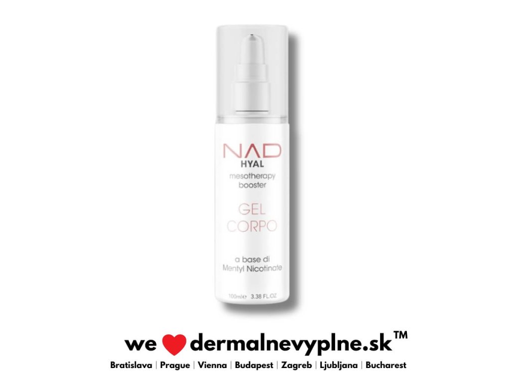 NAD HYAL -GEL CORPO - Mesotherapy Booster - Stimuluje mikrocirkuláciu, zlepšuje hydratáciu, zvyšuje elasticitu, redukuje celulitídu - je to kozmetická látka, ktorá dokáže rýchlo aktivovať mikrocirkuláciu pokožky bez toho, aby spôsobila nadmernú hyperémiu alebo podráždenie. Jej hlavná zložka, Mentylnikotinát, je zlúčenina Mentolu (chladivý účinok) a kyseliny Nikotínovej (prekurzor NAD a NAD+).