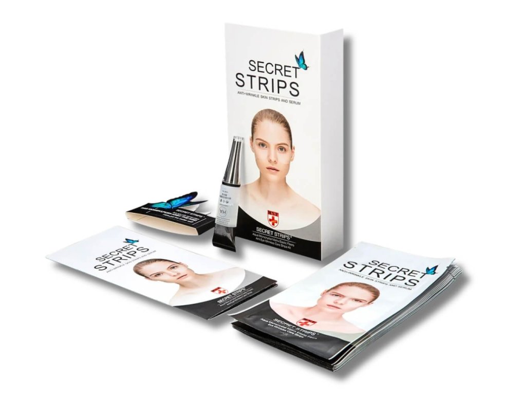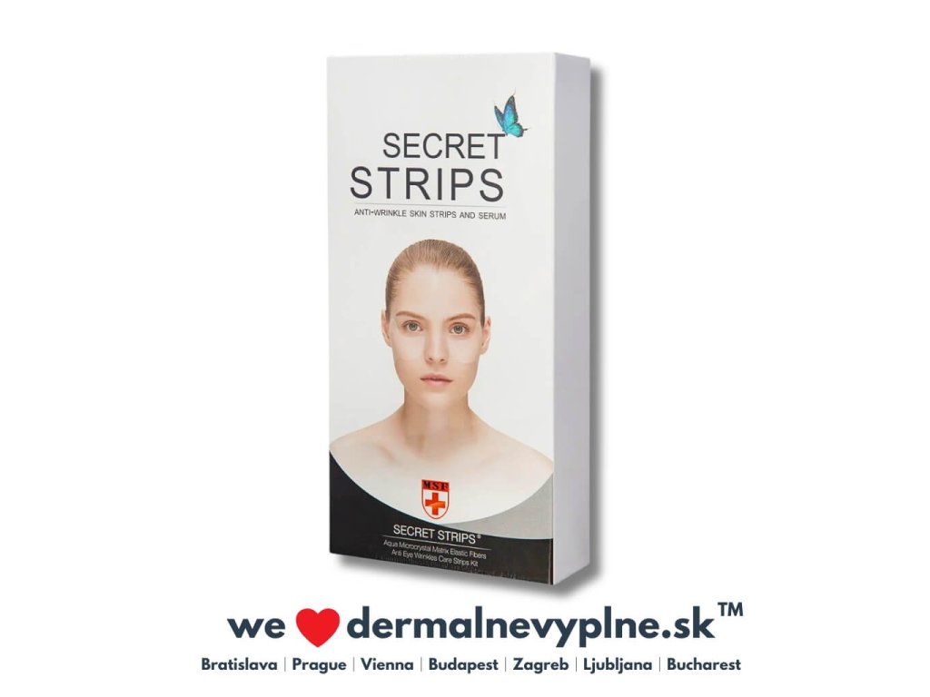 - Počas nosenia Secret Strips elastické napätie zároveň obmedzuje mimické pohyby, čím kontroluje a predchádza vzniku nových vrások a záhybov, ktoré sú často dôsledkom mimiky tváre.