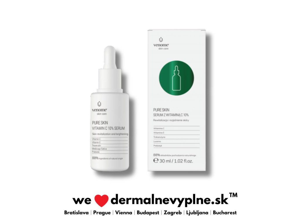 Venome Pure Skin - Serum s vysokou koncentráciou vitamínu C (10 %) v stabilnej forme. Vyhladzuje, rozjasňuje a zlepšuje elasticitu pokožky. Obohatené o trokserutín, vitamín E a prebiotiká.