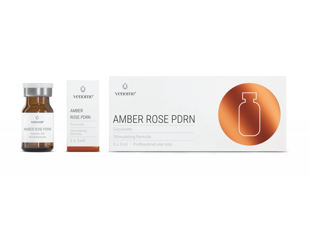 Venome Amber Rose je jedinečné stimulačné a revitalizačné ošetrenie, ktoré vďaka svojmu pokročilému zloženiu založenému na kombinácii PDRN (1 %), kyseliny jantárovej (1 %) a kyseliny hyalurónovej (1 %), peptidového komplexu a extraktu z kvetov šípky a ibišteka. Aktivuje silnú tkanivovú fibropláziu pre tvorbu nových proteínových vlákien, vrátane kolagénu typu I a III.